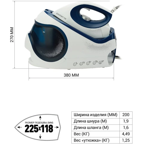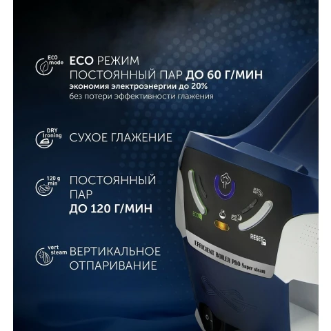 мощность: 2400 Вт, расход при постоянной подаче пара: 120 г/мин, расход при паровом ударе: 450 г/мин, максимальное давление пара: 7.5 бар, объём резервуара для воды: 1400 мл, подошва: керамика (PRO 5 Ceramic)