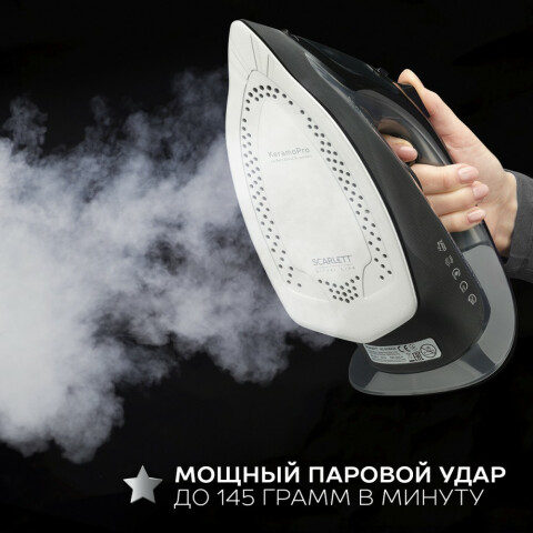 мощность 2400 Вт, подошва из керамики, вертикальное отпаривание, паровой удар, система самоочистки, мощность подачи пара до 145 г/мин