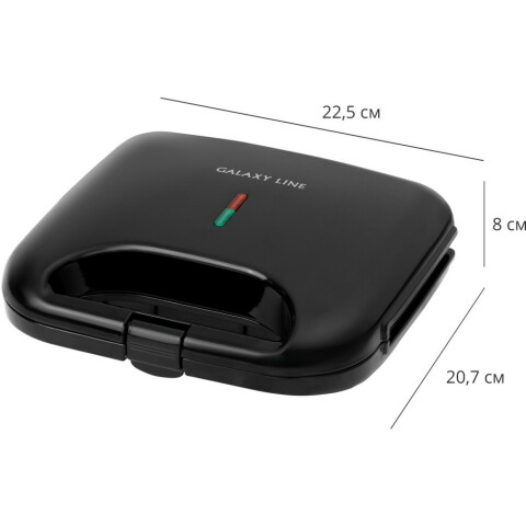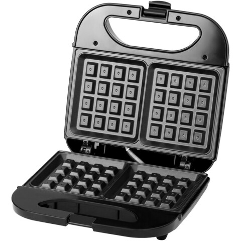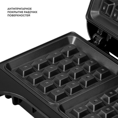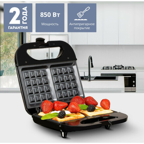 вафельница, антипригарное тефлоновое покрытие, мощность 850 Вт, форма: прямоугольник; корпус: термостокий пластик, ненагревающиеся ручки, индикатор нагрева