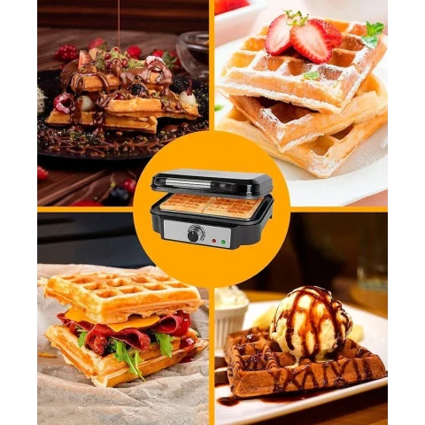 вафельница, антипригарное тефлоновое покрытие, мощность 1000 Вт, механическое управление, форма: 2 прямоугольника суммарно 25x17 см, индикатор нагрева, защита от перегрева, теплоизолированная ручка