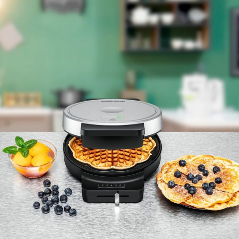для выпечки венских вафель, 850 Вт, рабочая поверхность диаметром 17.5 см (5 порций), не нагревающаяся ручка, механическое управление (плавная регулировка), защита от перегрева, антипригарное покрытие, индикатор нагрева