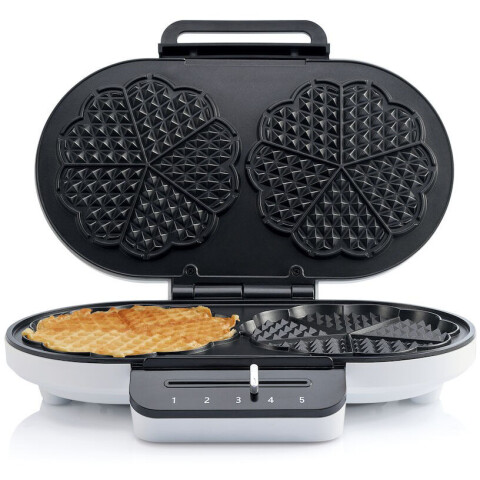 мощность 1200 Вт, механическое управление, пластиковый корпус, сменная панель: вафли, вид панели для вафель: сердечки, порций: 10, регулировка температуры, антипригарное покрытие, индикатор работы