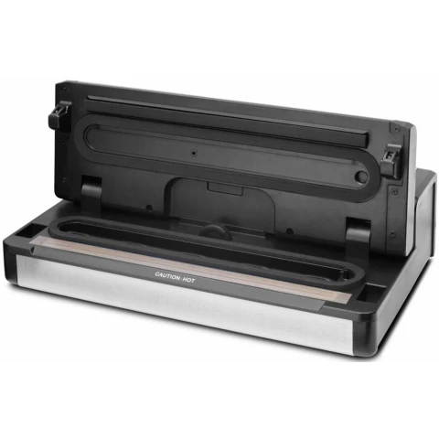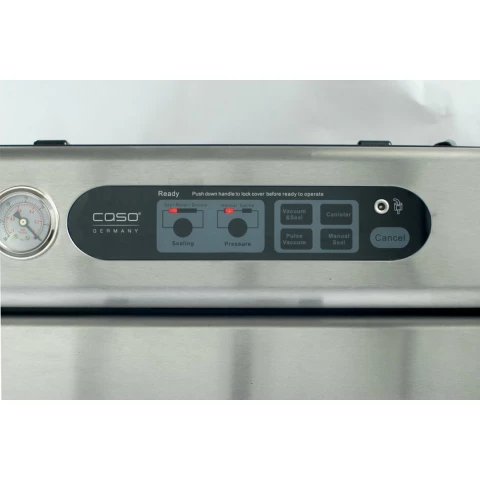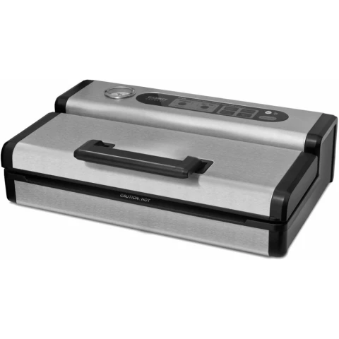 вакуумный упаковщик, мощность: 130 Вт, давление сжатия: 0.9 бар, скорость всасывания: до 20 л/мин, уровень шума: 68 дБ, двойной сварочный шов, импульсный режим, встроенный манометр, материал корпуса: нержавеющая сталь