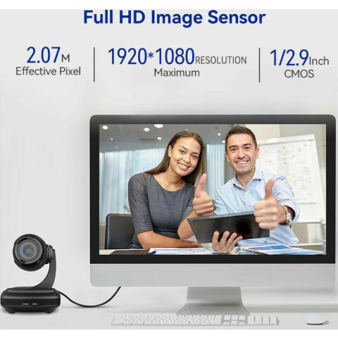 мини-видеокамера PTZ, 1/2.9" CMOS-сенсор, 2 Мп (1920x1080), 3x оптич.зум, обзор 90°, гор. поворот ±170°, вертикальный -30° +90°, 2D и 3D цифровое шумоподавление, авт. кадрирование, USB 2.0 Type-C