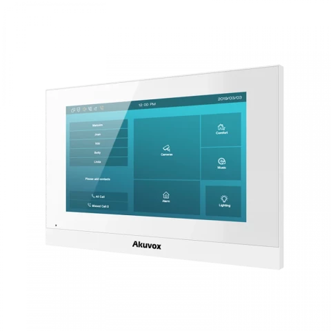 Бренд: AkuvoxIP интерком-монитор, 7" сенсорный экран 1024x600, ОС Android 6.0, питание PoE, поддержка SIP 2.0, RAM/ROM: 1GB/8GB, RS485, 8 входов для датчиков тревоги, микрофон с чувствительностью -58 дБ, динамик 2 Вт, Bluetooth 4.0, -10°C ~ +45°C