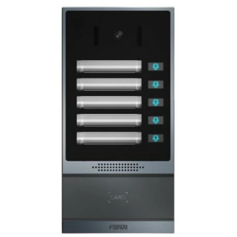 IP-видеодомофон, 5 физических кнопок, камера 2 Мп, угол обзора 120°, поддержка ONVIF, слот для карты TF, датчик RFID до 10000 пользователей, обнаружение движения, видеокодек H.264, HD-аудио