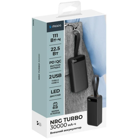 Бренд: Deppaаккумулятор ёмкостью 30000 мАч, выход: 2xUSB, вход: USB Type-C, быстрая зарядка, индикатор заряда