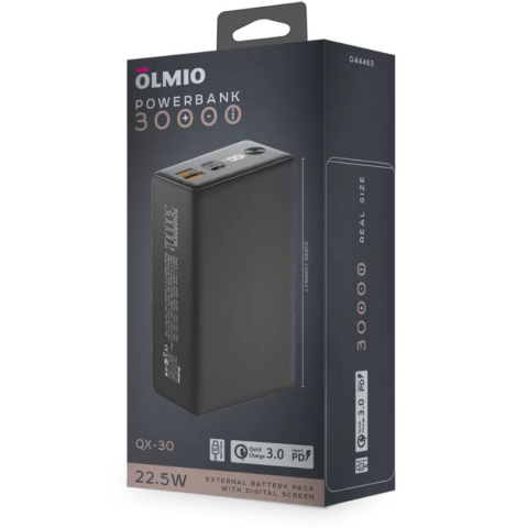 Бренд: Olmioаккумулятор ёмкостью 30000 мАч, выход: 2xUSB, USB Type-C, вход: USB Type-C, быстрая зарядка