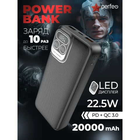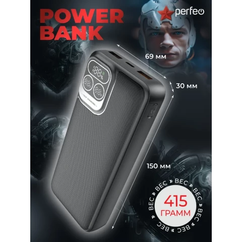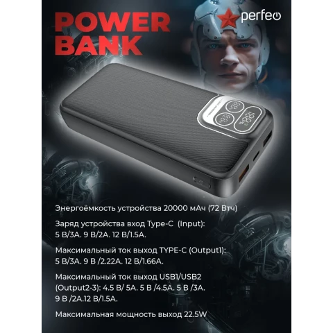 Бренд: Perfeoаккумулятор ёмкостью 20000 мАч, выход: 2xUSB, USB Type-C, вход: USB Type-C, 2xUSB, максимальный ток: 3 А, быстрая зарядка, индикатор заряда