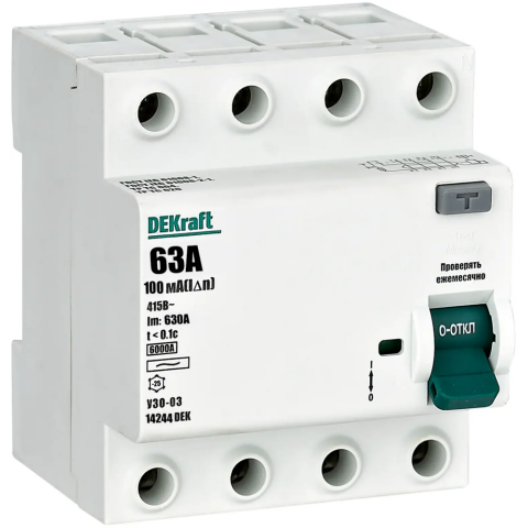 Бренд: DEKraftвыключатель на DIN-рейку, 4-полюсный, напряжение: 400 В, номинальный ток: 63 A, ток учётки: 100 мА, IP20