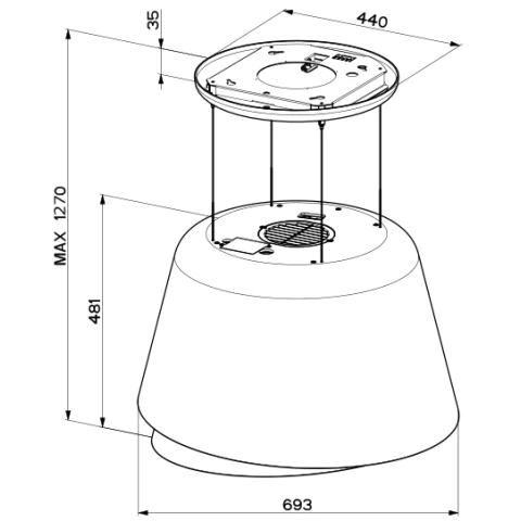 островная цилиндрическая вытяжка, количество скоростей: 4, производительность: 640 м3/ч, ширина встраивания: 70 см, электронное управление, периметриальное всасывание, интенсивный режим, таймер