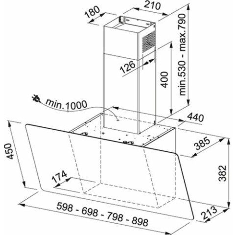 пристенная наклонная вытяжка, количество скоростей: 3, производительность: 720 м3/ч, ширина встраивания: 70 см, электронное управление, периметриальное всасывание, интенсивный режим, таймер