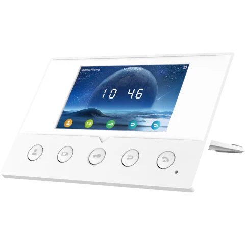 абонентская станция с цветным экраном 4.3" и разрешением 480х272, 5 физических функциональных клавиш, 4 SIP-линии, WI-FI, динамик 1,5 Вт, порт RJ-45 10/100 Мб/с, интерфейс тревожного входа х8, 12 В / 1 A, RS-485