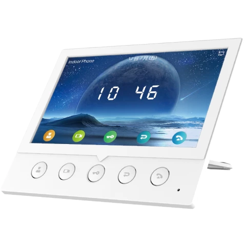 абонентская станция с цветным экраном 7" и разрешением 800x480, 5 физических функциональных клавиш, 4 SIP-линии, WI-FI, динамик 2 Вт, порт RJ-45 10/100 Мб/с, интерфейс тревожного входа х8, 12 В / 1 A, RS-485