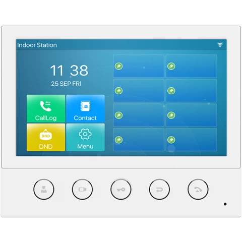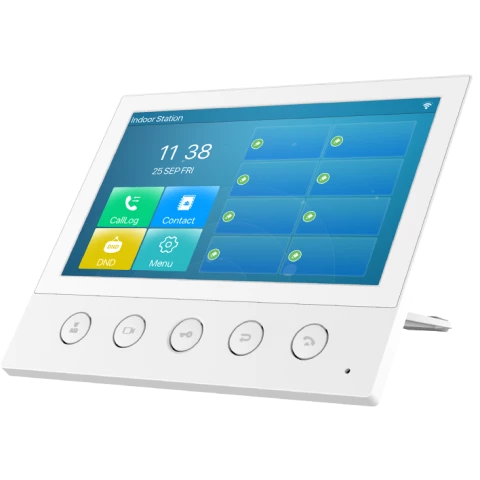 абонентская станция с цветным сенсорным экраном 7" и разрешением 800x480, 5 физических функциональных клавиш, 6 SIP-линий, WI-FI, динамик 2 Вт, порт RJ-45 10/100 Мб/с, интерфейс тревожного входа х8, 12 В / 1 A, RS-485