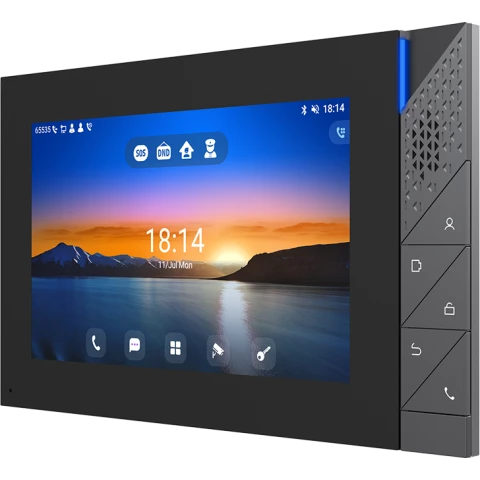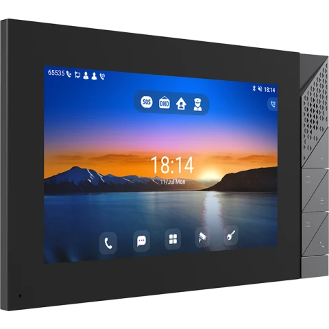 абонентская SIP-станция, цветной сенсорный экран 7", ОС Android 9.0, динамики 1.5 Вт, Wi-Fi 2.4 / 5 ГГц, Bluetooth 5.0, RS-485, 8 интерфейсов входа сигнала тревоги и 2 интерфейса выхода, PoE, RJ-45